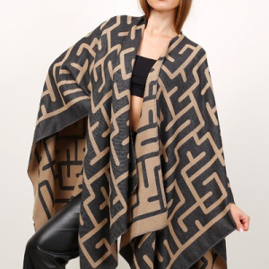Prix 9,5 EURO Facbrication en Chine Composition:100% Acrylique Un poncho ample avec un motif géométrique Le motif semble s’inspirer de formes rectangulaires ou labyrinthiques, créant un look moderne et élégant. Le tissu semble être assez épais, idéal pour les saisons plus fraîches.